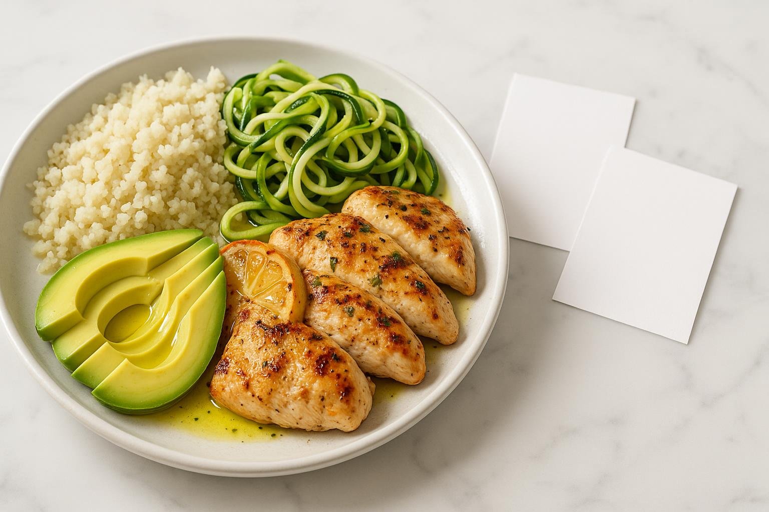 Template A: Protein + Veg + Fat + Flavor. Pick a protein (chicken, beef, seafood), add a veg swap (cauliflower rice or zucchini), finish with a fat source (olive oil, avocado, butter) and a bold flavor boost (garlic, herbs, citrus).