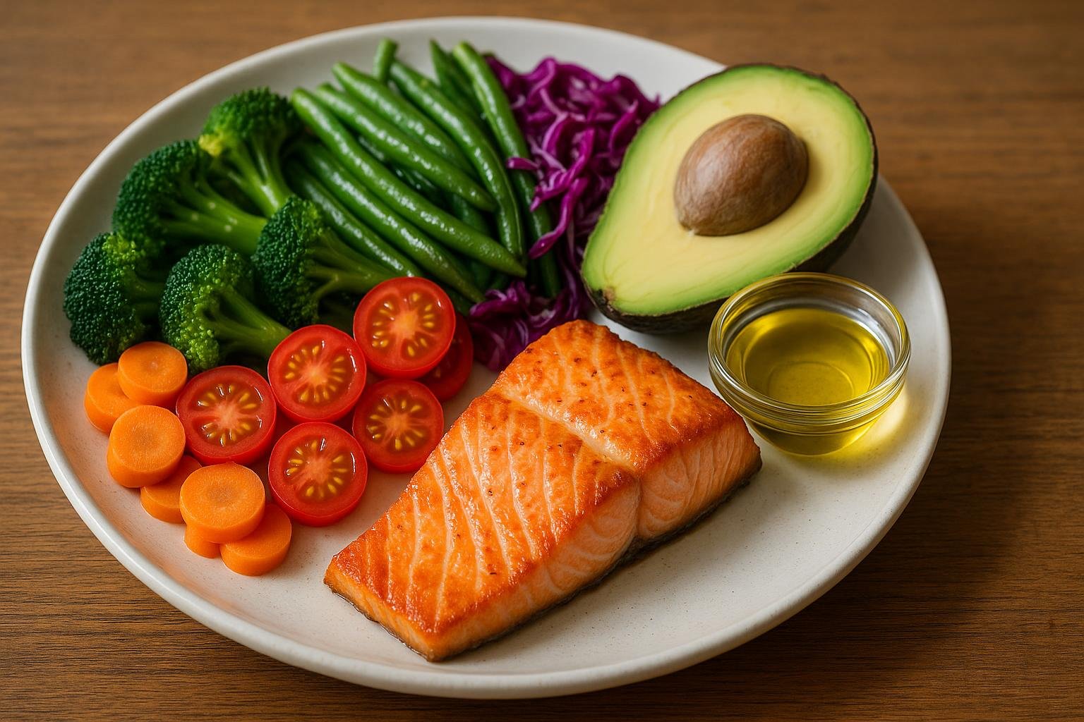 • Half the plate: fiber-rich vegetables and leafy greens for fullness and fiber.